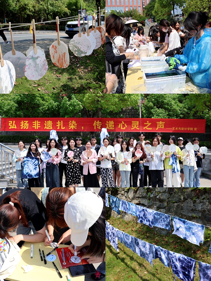 “真没想到!展开之后会这么好看!”“太神奇了,自己就可以做出独一无二的作品!”现场老师和同学在志愿者的引导下,学习扎染技巧后发挥自己的创意和想象力,通过折叠、捆绑、浸染等步骤,将一件件白色T恤、小布包、布匹变成了独一无二的艺术作品。大家沉浸在色彩与创意的世界中,脸上洋溢着专注与喜悦,现场充满了欢声笑语。活动现场还设置了传统纹样吧唧、漆扇项目,也深受喜爱。