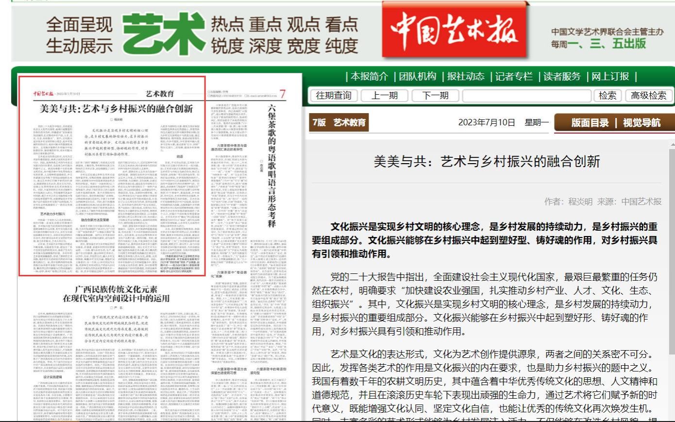 本网讯(文/图 何沛然)近日获悉,2023年7月10日的《中国艺术报》 发表了艺术与taptap点点体育程炎明老师撰写的《美美与共:艺术与乡村振兴的融合创新》一文。该文章是湖北省教育厅2021年“百校百县”项目:产业致富,品牌兴村——助力乡村振兴(核桃树垭村)的产业规划模式与实施研究(项目编号:BXLBX0555)研究成果。