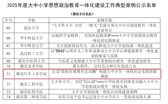 教育部高校思想政治工作质量提升综合改革与精品建设项目组织申报由宣传部牵头,学工部及各二级公司负责实施。此次入选案例由taptap点点体育、学工部、双创公司等单位共同参与,以公司“行走的大思政课”实践育人体系为基础,通过深入挖掘政府、大中小学、企业、社区、乡村等丰富育人资源,构建政、校、企、地四方联动机制,打造了“政校企地教育活动圈”,形成了具有汽院特色的思政育人共同体。通过统筹梳理实践育人资源清单,有机衔接各类实践教育资源,推动大中小学及社会资源开放共享,持续丰富思想政治教育载体途径,完善资源共享、多元共治的长效机制,构建“大中小学社会实践资源图谱”。