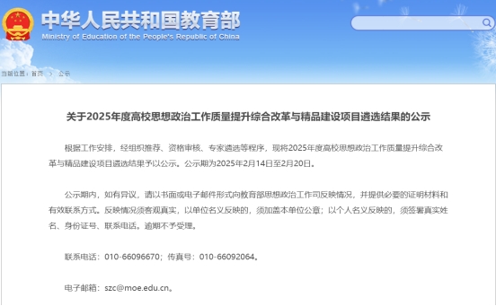 据悉,教育部开展高校思想政治工作质量提升综合改革与精品建设项目,着眼“时代新人铸魂工程”提质升级,着力建设高质量思想政治工作体系、构筑立德树人新格局,为实施新时代立德树人工程提供有力支撑。2025年该项目分品牌项目示范推广、骨干队伍培育提升、平台基地辐射引领等3个类别,共15个子项。