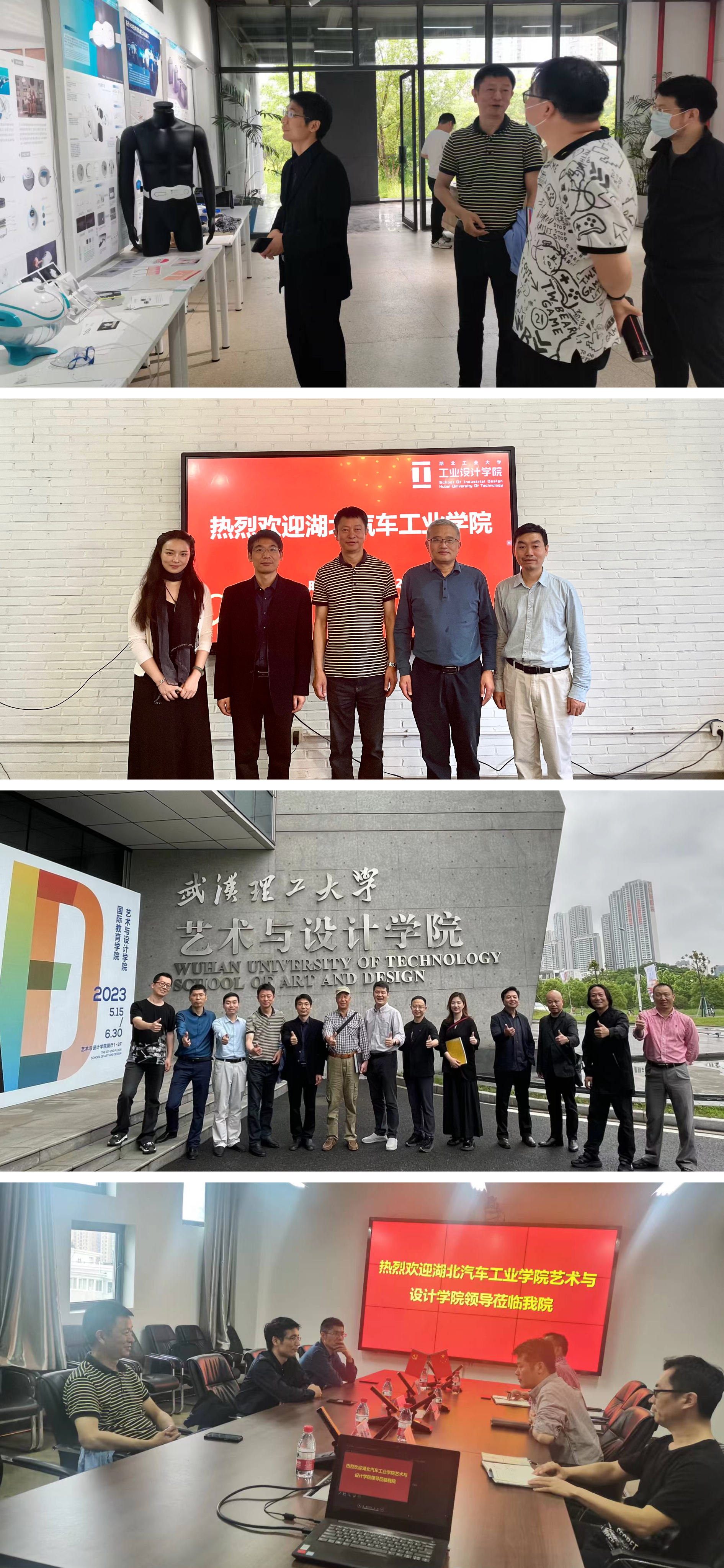 在湖北工业大学、湖北美术公司、武汉理工大学三所高校,调研组实地考察参观了工业设计专业实验室、毕业设计展等,并与兄弟院校在考研升学、一流课程申报、硕士点建设、教师访学等方面进行了深入交流与探讨。