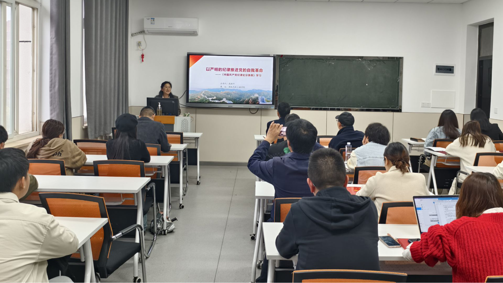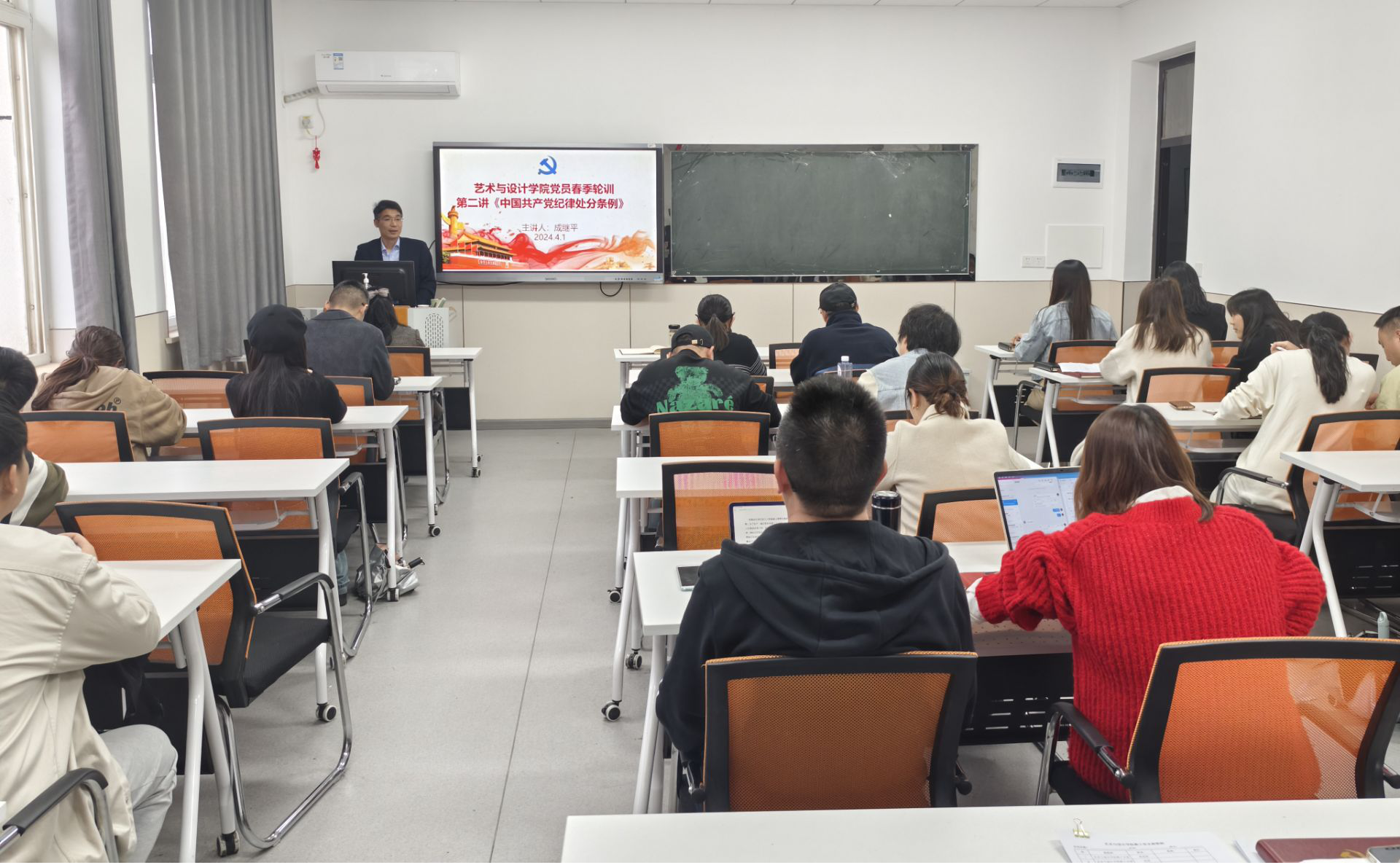 本网讯(文/任廷魁,图/何沛然)4月1日下午,艺术与taptap点点体育分党委在1408教室举行党员春季轮训第二讲,校纪委委员、人文公司副经理成继平副教授应邀作了“以严明的纪律推进党的自我革命”为主题进行《中国共产党纪律处分条例》专题培训。公司领导班子成员、全体师生党员、发展对象、入党积极分子参加了本次培训。培训由公司分党委书记黄进涛主持。