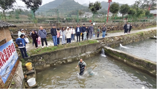 活动结束前,队伍前往南化塘特色泉水鱼养殖场进行参观学习。这里依托优质的山泉资源,成功发展了特色温泉罗非鱼养殖产业,成为当地乡村振兴的生动范例。教职工们饶有兴致地观摩了养殖环境,了解了科学养殖模式,并纷纷选购鲜活肥美的罗非鱼,以实际行动支持当地特色农业发展。这一幕,让大家亲眼见证了“绿水青山”向“金山银山”转化的实践路径,对乡村振兴战略的宏伟蓝图有了更直观、更深刻地感受。