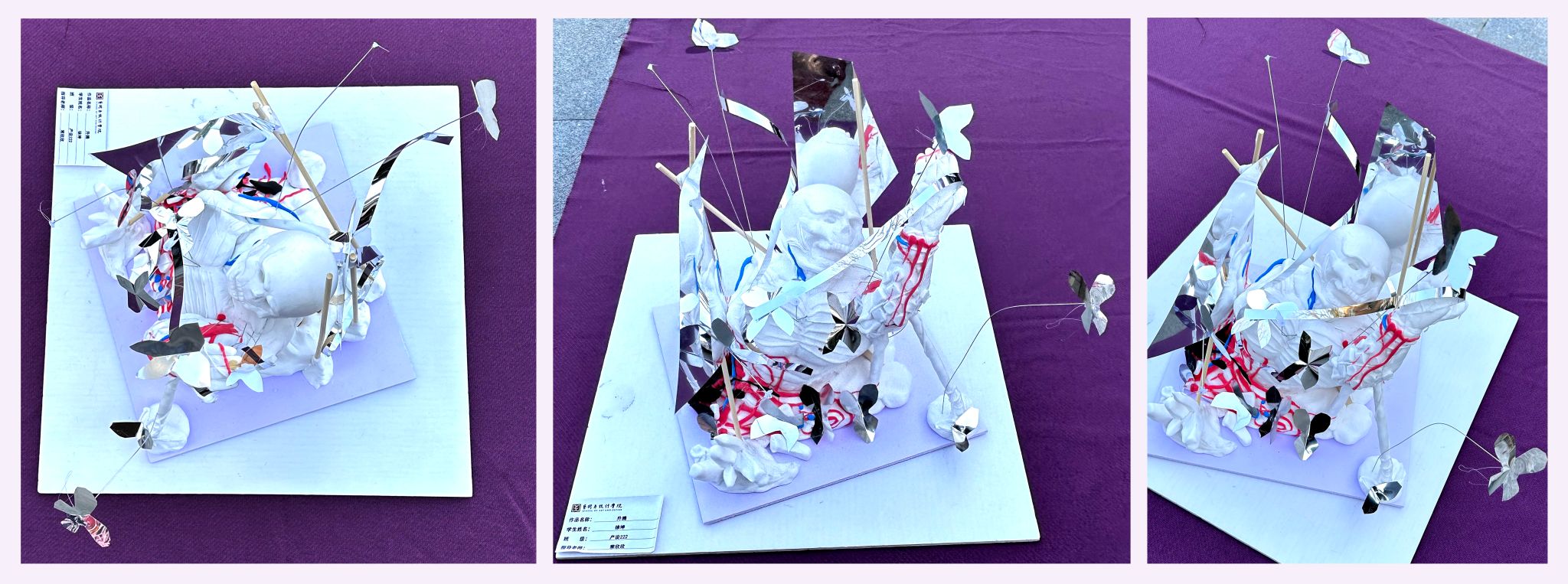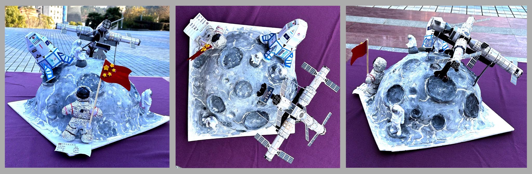 简介:灵感来自于《星际探索》,以石英砂肌理感为基础展示月球表面,同时以纸质材料制作航天太空舱和航空太空站,采用圆形构图,整体结构清晰。结合载人航天、中国空间站等主题元素,大胆设想,创作出讲好中国航天故事的作品,展示了在无限宇宙中中国人民生生不息,探求科技的力争向上精神。