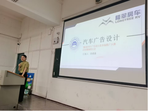 紧接着营销专业徐锐康同学分享了短视频及网络推广做法,视觉传达设计专业党雨怡同学分享了广告设计思路。两位一等奖同学讲述其创作过程和创作理念,展现了参赛者对房车市场的深刻理解,他们的精彩表现博得了阵阵掌声。